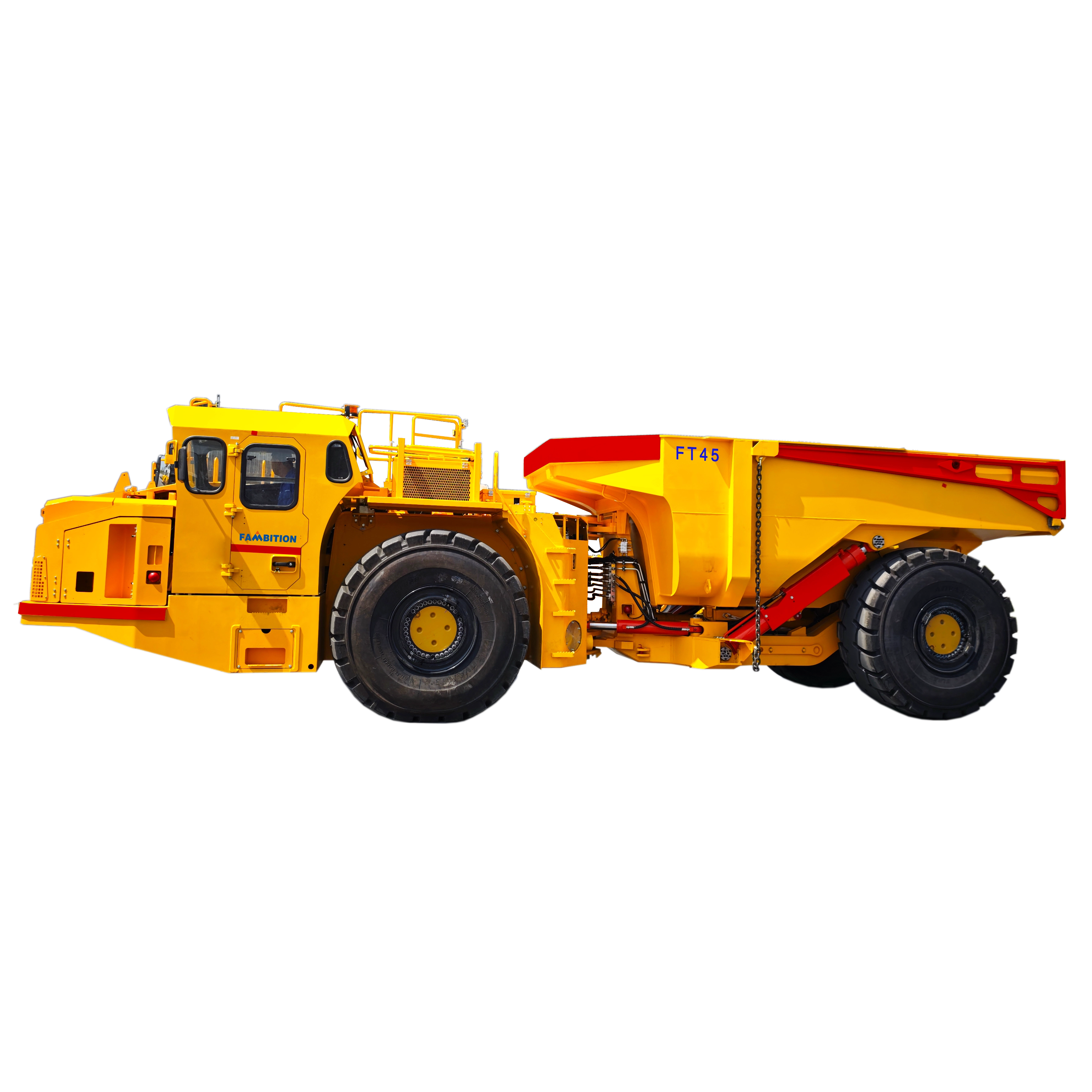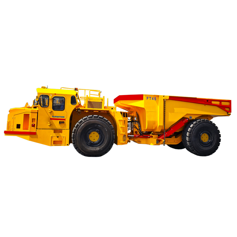 The FT45 underground mining truck is a heavy-duty articulated dump truck specifically engineered for large-scale underground non-coal mines and tunnel construction projects. Manufactured by FAMBITION – a well-established specialized mining trackless equipment manufacturer – this 45-ton capacity underground haul truck delivers exceptional performance in the most demanding underground hard rock transportation environments.