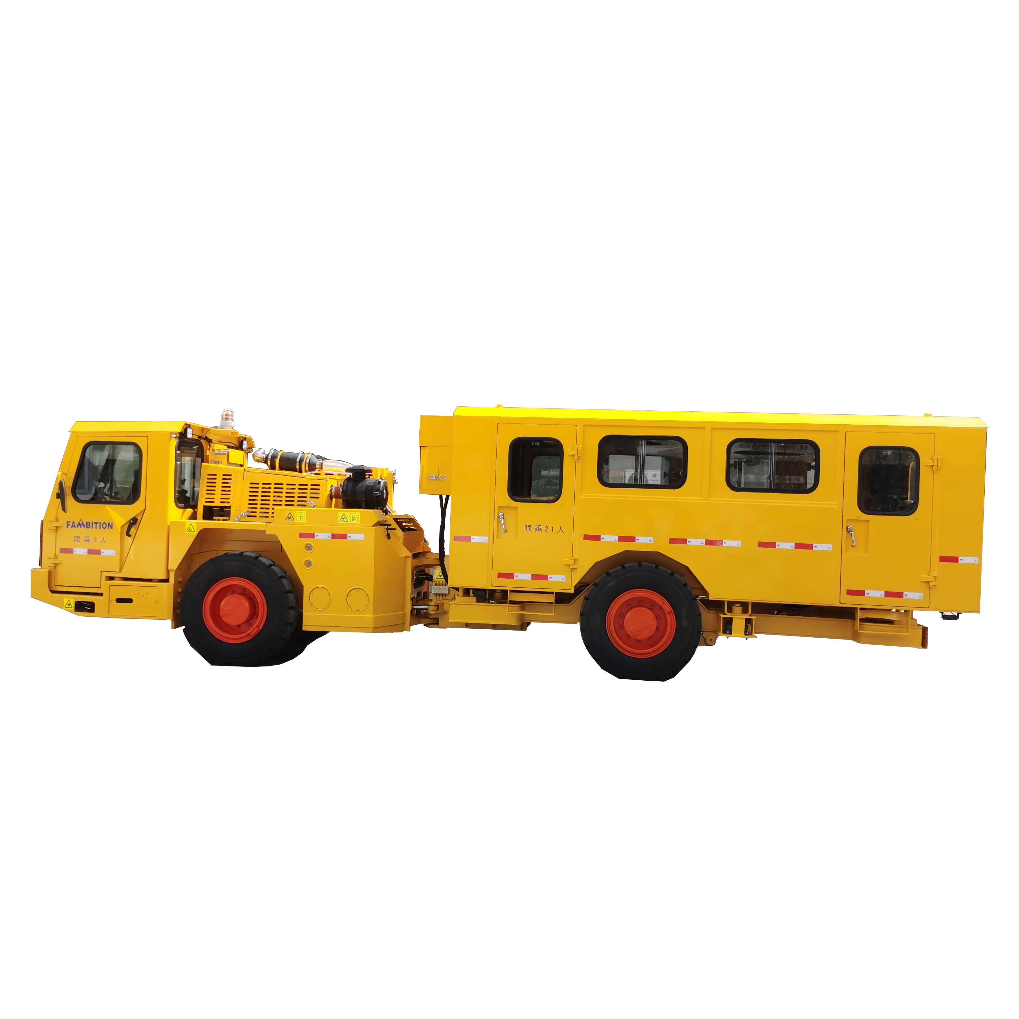 The FPT24 is a 24-passenger underground personnel carrier designed specifically for transporting personnel in non-coal underground mines and tunnel projects, capable of safely and efficiently transporting miners and workers.