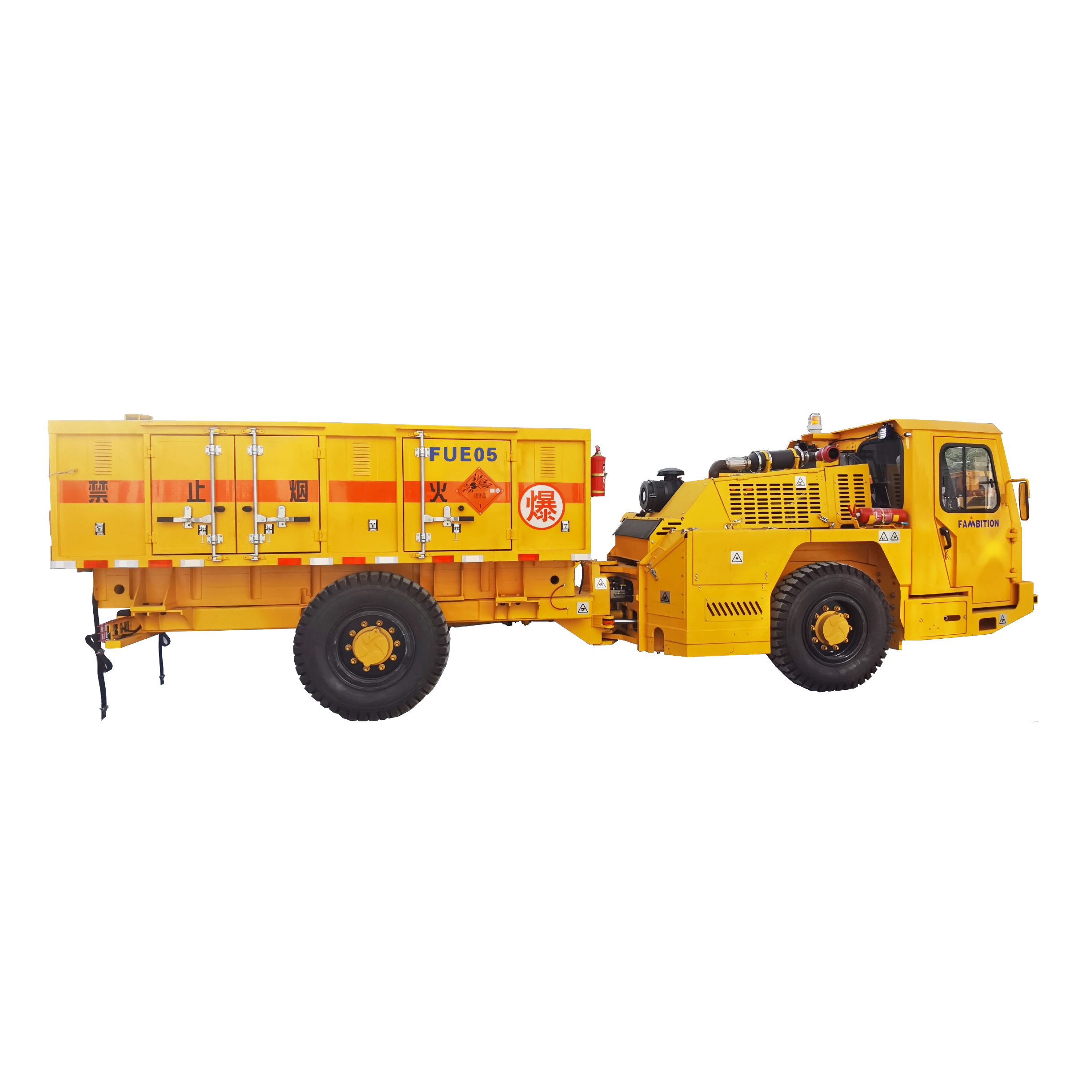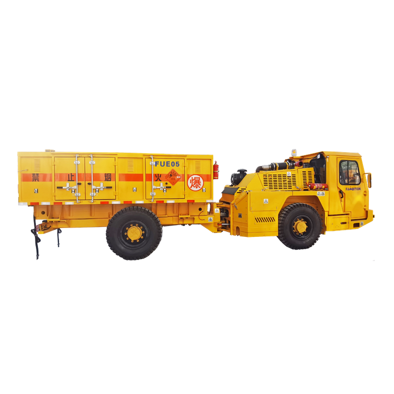 The FUE05 is a trackless explosives transport vehicle with a maximum payload capacity of 5 tons. This model features high-quality international-standard components, an articulated frame, and a full-hydraulic power steering system. Its braking system utilizes fully enclosed, multi-disc wet brakes integrated with SAHR technology, while power is supplied by a low-emission Cummins turbocharged engine compliant with National IV emission standards. The operator cabin is FOPS/ROPS certified and equipped with a built-in multi-functional display that allows for real-time monitoring of equipment status and provides troubleshooting support.
